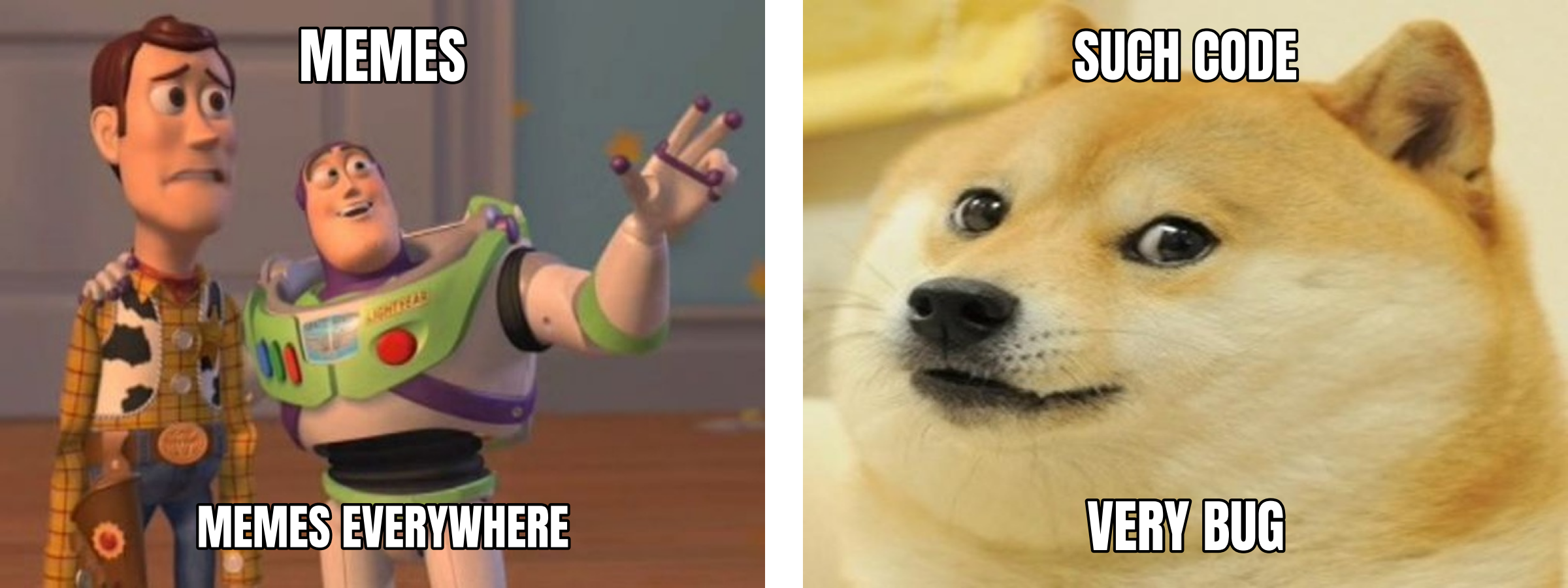 memes.meme("doge", "such code", "very bug", ax=ax2, show=False)