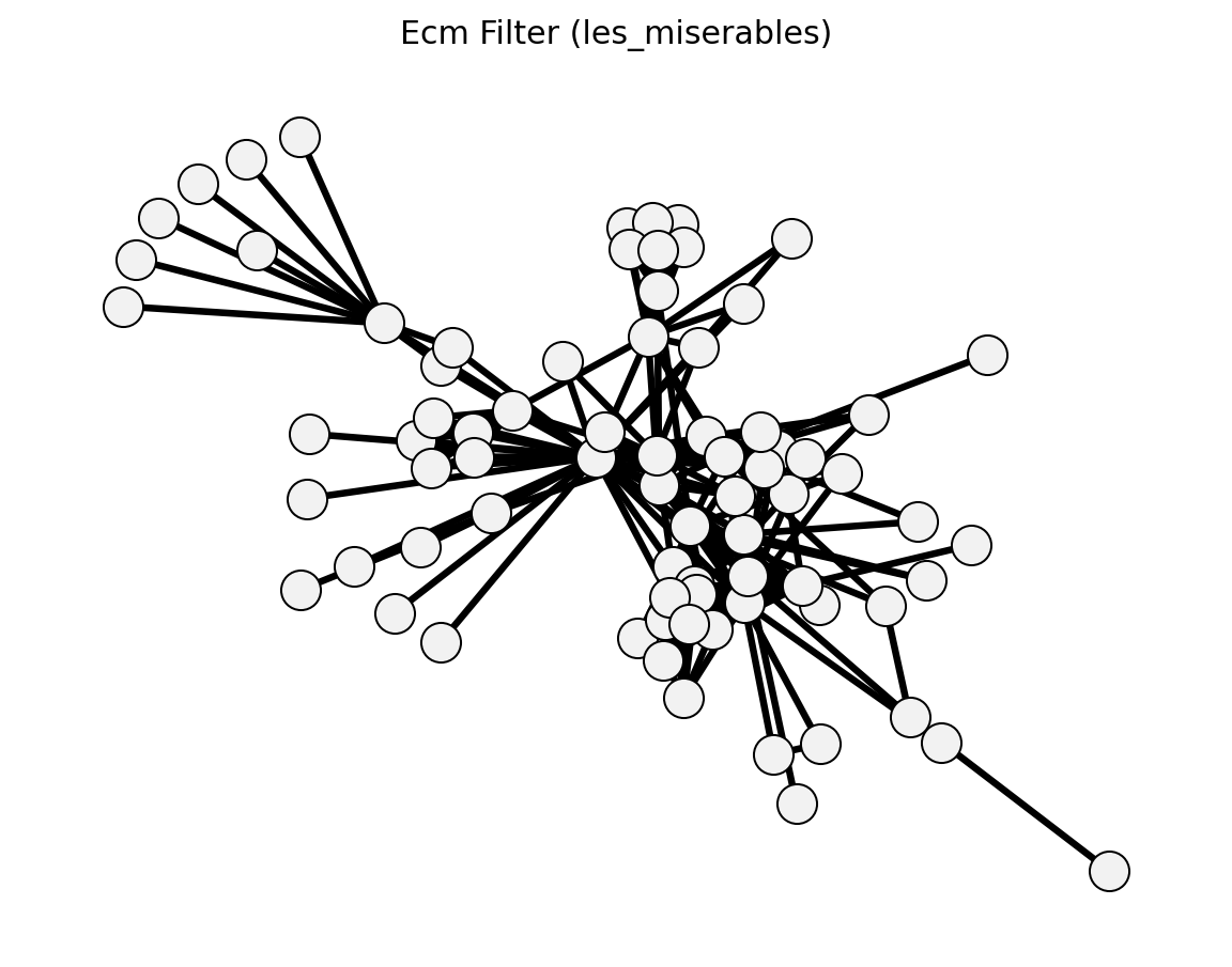 >>> import networkx as nx >>> from networkx_backbone import ecm_filter, threshold_filter >>> G = nx.les_miserables_graph() >>> H = ecm_filter(G) >>> backbone = threshold_filter(H, "ecm_pvalue", 0.05, mode="below") >>> backbone.number_of_edges() <= H.number_of_edges() True