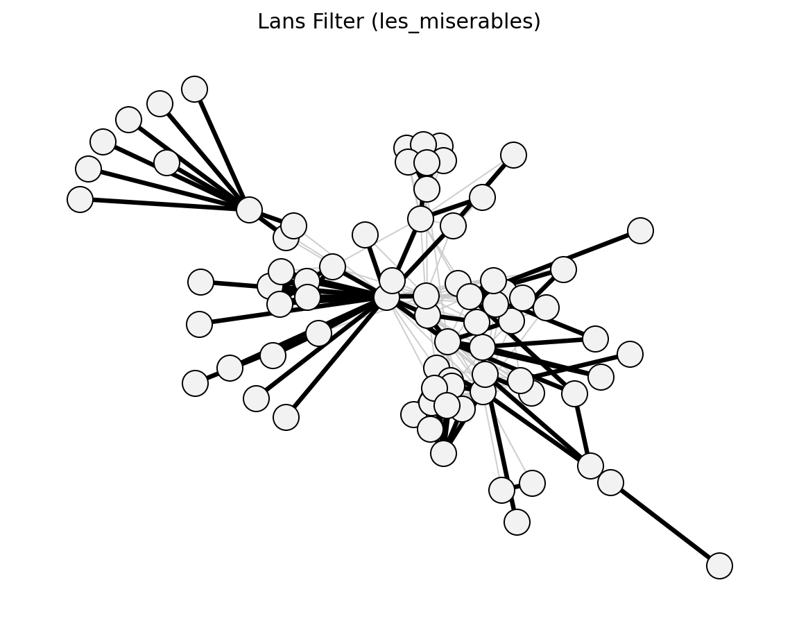 >>> import networkx as nx >>> from networkx_backbone import lans_filter, threshold_filter >>> G = nx.les_miserables_graph() >>> H = lans_filter(G) >>> backbone = threshold_filter(H, "lans_pvalue", 0.05, mode="below") >>> backbone.number_of_edges() <= H.number_of_edges() True