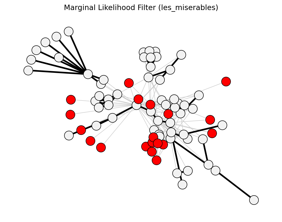 >>> import networkx as nx >>> from networkx_backbone import marginal_likelihood_filter, threshold_filter >>> G = nx.les_miserables_graph() >>> H = marginal_likelihood_filter(G) >>> backbone = threshold_filter(H, "ml_pvalue", 0.05, mode="below") >>> backbone.number_of_edges() <= H.number_of_edges() True